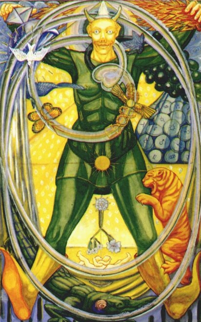 Air. Aleph. The Fool is Air. Emptiness, also Potential Purity. He holds the Wand of Fire, the Cup of Water, the Sword of Air, and the bag of planetary Disks. Round him is the rainbow issuing from and returning to his heart, he wears the fool’s cap, the horns of Bacchus, he stands on Harpocrates, the Egyptian symbol of adolescent Fertility, he is unconscious of the tiger tearing at his side, he is the Green Man of the Celts, Daluah and Parsival. This is the moment of divine consciousness.