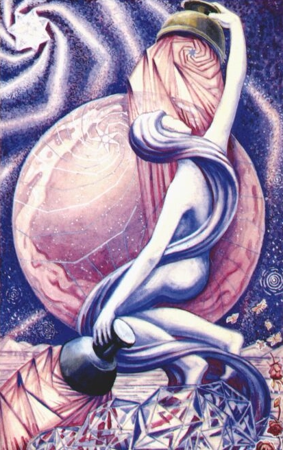 Aquarius. Daleth. This is built up as a design on a spiral to show the rising force of a new age. The woman holds two cups, the north and south poles of magnetic attraction. Above her a new star is rising, beneath her are the crystallizing dogmas of a former Age.