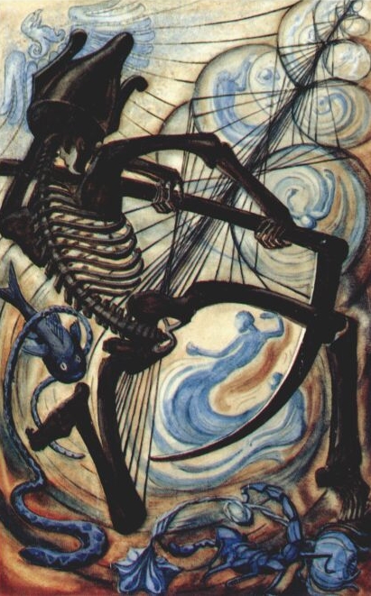 The central figure is executing the Dance of Death (skeleton and scythe are both Saturnian figures), and on his head he wears the crown of Osiris. The influence of Saturn is expressed in the negative aspect of Death as representing those essential forms which are not destroyed by the ordinary changes of nature; the positive and creative side is seen in the sweep of the scythe, which calls into being bubbles, symbolizing new lives.