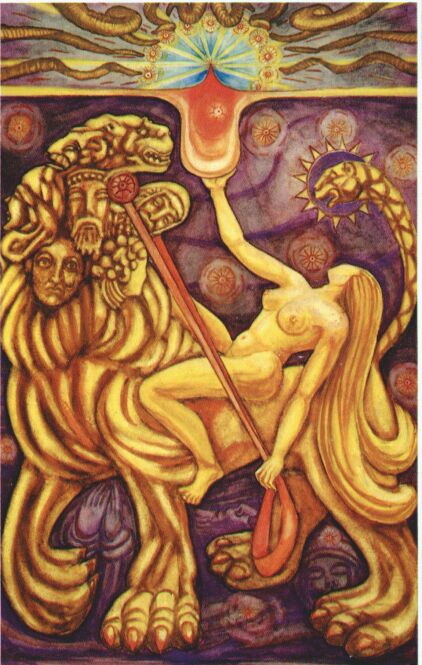 This card was formally called Strength. It implies, however, not only strength, but joy in strength exercised. The seven heads of the lion are respectively, that of an angel, saint, poet, adulteress, warrior, satyr, and lion-serpent. The central figure is the woman, who has surrendered herself to all the forces of creation and who rides astride of the Beast. In her left hand she holds the reins, as representing the passion which unites them, and in her right she holds aloft the Cup aflame with love and death. In this Cup are mingled the elements of the sacrament of the Aeon. In the background are the bloodless figures of the saints on whom this mirage travails, for their whole life has been absorbed into the Holy Grail.