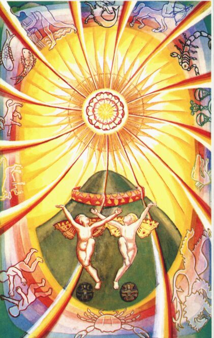 This card represents the Lord of the new Aeon, the Lord of Light, Life, Liberty and Love, and the complete emancipation of the human race. The green mound represents the fertile earth, but the presence of a wall shows that the new Aeon does not mean the absence of control. The twin children are represented as dancing outside the wall, because they typify the new stage in human history, the stage of complete freedom from the restrictions imposed by such ideas as sin and death.