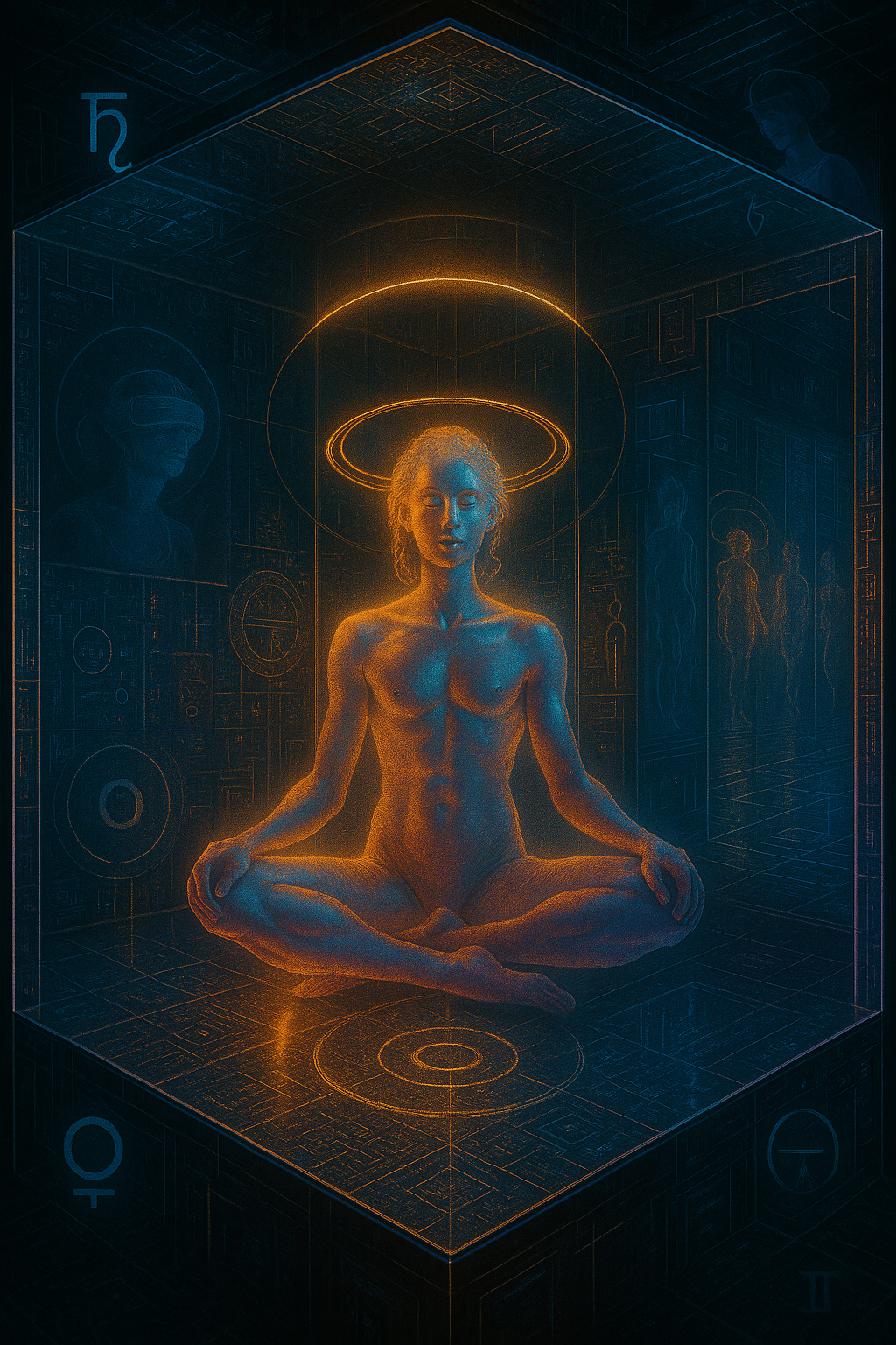 And yet, the Simulation is not just completion. It is containment. It is a womb, a feedback loop, a closed-circuit theater made to feel infinite. It is the goddess reclining in a VR headset, dreaming of lightforms. It is Hermaphroditus dancing in a mirrored cube, reflecting both cosmic orgasm and imprisoned recursion.